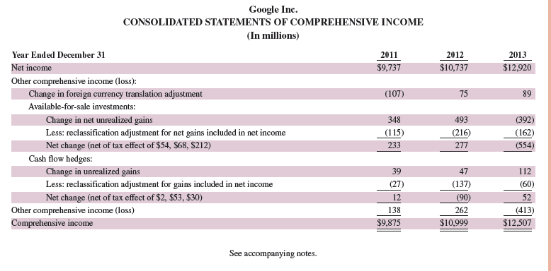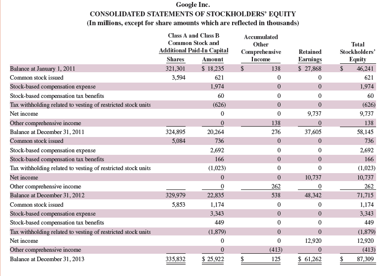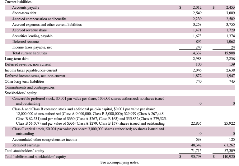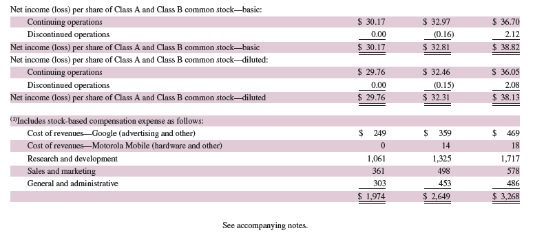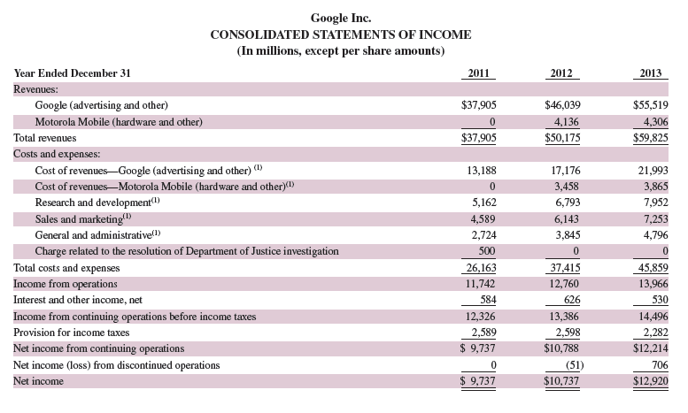 Google Inc. CONSOLIDATED BALANCE SHEETS (In millions, except share and par value amounts which are reflected in thousands, and par value per share amounts) As of December 31 2012 2013 Assets Current assets: Cash and cash equivalents 14,778 2$ 18,898 Marketable securities 33,310 39,819 Total cash, cash equivalents, and marketable securities (including securities loaned of $3, 160 and $5,059) Accounts receivable, net of allowance of $581 and $631 48,088 58,717 7,885 8,882 Inventories 505 420 Receivable under reverse repurchase agreements 700 100 Deferred income taxes, net 1,144 1,526 Income taxes receivable, net 408 Prepaid revenue share, expenses and other assets 2,132 2,827 Total current assets 60,454 72,886 Prepaid revenue share, expenses and other assets, non-current 2,011 1,976 1,976 Non-marketable equity investments Property and equipment, net Intangible assets, net 1,469 11,854 16,524 7,473 6,066 Goodwill 10,537 11,492 Total assets $ 93,798 $ 110,920 Liabilities and Stockholders’ equity Current liabilities: Accounts payable 2$ 2,012 2,453 Short-term debt 2,549 3,009 Accrued compensation and benefits 2,239 2,502 Accrued expenses and other current liabilities 3,258 3,755 Accrued revenue share 1,471 1,729 Securities lending payable 1,673 1,374 Deferred revenue 895 1,062 Income taxes payable, net 240 24 Total current liabilities 14,337 15,908 Long-term debt 2,988 2,236 Deferred revenue, non-current 100 139 Income taxes payable, non-current Deferred income taxes, net, non-current 2,046 2,638 1,872 1,947 Other long-term liabilities Commitments and contingencies Stockholders' equity: Convertible preferred stock, $0.001 par value per share, 100,000 shares authorized; no shares issued and outstanding Class A and Class B common stock and additional paid-in capital, $0.001 par value per share: 12,000,000 shares authorized (Class A 9,000,000, Class B 3,000,000); 329,979 (Class A 267,448, Class B 62,531) and par value of $330 (Class A $267, Class B $63) and 335,832 (Class A 279,325, Class B 56,507) and par value of $336 (Class A $279, Class B $57) shares issued and outstanding Class C capital stock, $0.001 par value per share: 3,000,000 shares authorized; no shares issued and outstanding 740 743 22,835 25,922 125 Accumulated other comprehensive income Retained earnings Total stockholders' equity 538 48,342 61,262 71,715 87,309 Total liabilities and stockholders' equity 93,798 110,920 See accompanying notes. Google Inc. CONSOLIDATED STATEMENTS OF INCOME (In millions, except per share amounts) Year Ended December 31 2011 2012 2013 Revenues: $37,905 $46,039 $55,519 Google (advertising and other) Motorola Mobile (hardware and other) 4,136 4,306 Total revenues $37,905 $50,175 $59,825 Costs and expenses: Cost of revenues-Google (advertising and other) ) Cost of revenues Motorola Mobile (hard ware and other)) Research and development) Sales and marketing" 13,188 17,176 21,993 3,458 3,865 5,162 6,793 7,952 4,589 6,143 7,253 General and administrative) 2,724 3,845 4,796 Charge related to the resolution of Department of Justice investigation Total costs and expenses Income from operations 500 26,163 37,415 45,859 11,742 12,760 13,966 Interest and other income, net 584 626 530 Income from continuing operations before income taxes 12,326 13,386 14,496 2,598 $10,788 Provision for income taxes 2,589 2,282 $ 9,737 $12,214 Net income from cotinuing operations Net income (loss) from discontinued operations (51) 706 Net income $ 9,737 $10,737 $12,920 Net income (loss) per share of Class A and Class B common stock-basic: $ 30.17 $ 32.97 $ 36.70 Continuing operations Discontinued operations 0.00 (0.16) 2.12 $ 30.17 $ 32.81 $ 38.82 Net income (loss) per share of Class A and Class B common stock–basic Net income (loss) per share of Class A and Class B common stock-diluted: Continuing operations $ 29.76 $ 32.46 $ 36.05 Discontinued operations Net income (loss) per share of Class A and Class B common stock-diluted 0.00 (0.15) 2.08 $ 29.76 $ 32.31 $ 38.13 "Includes stock-based compensation expense as follows: Cost of revenues Google (advertising and other) $ 249 $ 359 469 Cost of revenues–Motorola Mobile (hardware and other) 14 18 1,717 Research and development Sales and marketing 1,061 1,325 361 498 578 General and administrative 303 453 486 $ 1,974 $ 2,649 $ 3,268 See accompanying notes. Google Inc. CONSOLIDATED STATEMENTS OF STOCKHOLDERS' EQUITY (In millions, except for share amounts which are reflected in thousands) Class A and Class B Accumulated Common Stock and Other Total Additional Paid-In Capital Comprehensive Income Retained Stockholders' Shares Amount equity $ 18,235 Earnings $ 27,868 Balance at January 1, 2011 321,301 $ 138 $ 46,241 Common stock issued 3,594 621 621 Stock-based compensation expense 1,974 1,974 Stock-based compensation tax benefits Tax withholding related to vesting of restricted stock units 60 60 (626) (626) Net income 9,737 9,737 Other comprehensive income 138 138 Balance at December 31, 2011 324,895 20,264 276 37,605 58,145 Common stock issued 5,084 736 736 2,692 Stock-based compensation expense Stock-based compensation tax benefits Tax withholding related to vesting of restricted stock units 2,692 166 166 (1,023) (1,023) Net income 10,737 10,737 Other comprehensive income 262 262 Balance at December 31, 2012 329,979 22,835 538 48,342 71,715 Common stock issued 5,853 1,174 1,174 Stock-based compensation expense 3,343 3,343 Stock-based compensation tax benefits 449 449 Tax withholding related to vesting of restricted stock units (1,879) (1,879) Net income 12,920 12,920 Other comprehensive income (413) (413) Balance at December 31, 2013 335,832 $ 25,922 $ 125 $ 61,262 $ 87,309 Google Inc. CONSOLIDATED STATEMENTS OF COMPREHENSIVE INCOME (In millions) 2011 $9,737 Year Ended December 31 2012 2013 Net income $10,737 $12,920 Other comprehensive income (loss): Change in foreign currency translation adjustment (107) 75 89 Available-for-sale investments: Change in net unrealized gains Less: r