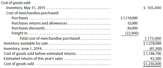 Cost of goods sold: Inventory, May 31, 20Y5 . Cost of merchandise purchased: $ 105,000 ..... .... Purchases ..... $ 1,110,000 Purchases returns and allowances 55,000 Purchases discounts.. 30,000 Freight in...... Total cost of merchandise purchased.. (22,000) 1,173,000 Inventory available for sale.... Inventory, June 1, 20Y4...... Cost of goods sold before estimated returns Estimated returns of this year's sales $ 1,278,000 (91,300) $ 1,186,700 43,300 Cost of goods sold .. $1,230,000