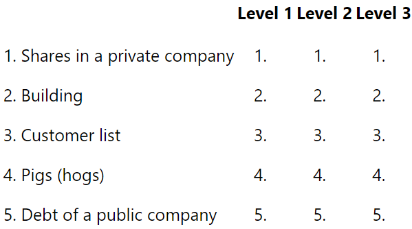 Identify the level in the hierarchy that would be most appropriate for measuring the following items using the fair-value hierarchy: