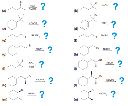 Br Br ? ? Naci NaOH DMSO (a) (b) Br ? I-BUOK DBN (c) (d) ? ? 1-BUOK NASH (e) (f) Br ? Br ? NaOH NaOE (g) (h) Br ? ? EIOH NaOH Heat (i) Br Br ? NaOMe NaOMe (k) (1) Br NaOH ? Br NaOEI ? (m) (n)