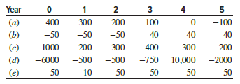 > According to Descartes’ rule of signs, determine the possible number of i* values for the net cash flow series with the following signs: (a) −−−+++−+− (b) −−−−−−+++++ (c) ++++−−−−−−+−+−−− (d) −−++++−