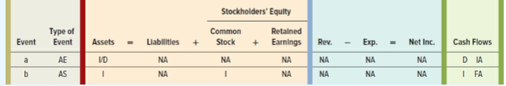 Stockholders' Equity Туре of Event Common Retained Event Assets Liabilities Stock Earnings Rev. Еxp. Net Inc. Cash Flows %3D D IA I FA a AE VD NA NA NA NA NA NA b. AS NA NA NA NA NA