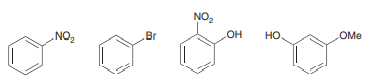 > Predict the product(s) obtained when each of the following compounds is treated with a mixture of nitric acid and sulfuric acid: Br NO2 (a) (h) (c) OMe (d) (e)