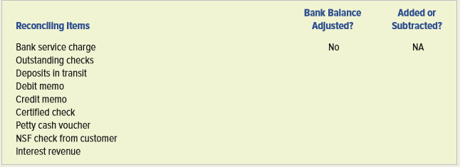 Bank Balance Added or Reconciling Items Adjusted? Subtracted? Bank service charge Outstanding checks Deposits in transit Debit memo No NA Credit memo Certified check Petty cash voucher NSF check from customer Interest revenue