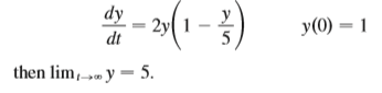 dy y 2y( 1 5 y(0) = 1 %3D dt then lim, y = 5.