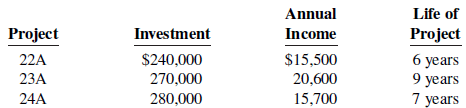 Annual Life of Project Investment Income Project 22A $240,000 $15,500 20,600 6 years 9 years 7 years 23А 270,000 24A 280,000 15,700