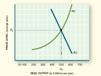 > Assume that the accompanying graph depicts aggregate supply and demand conditions in an economy. Full employment occurs when $6 trillion of real output is produced. (a) What is the equilibrium rate of output? (b) How far short of full employment is the e