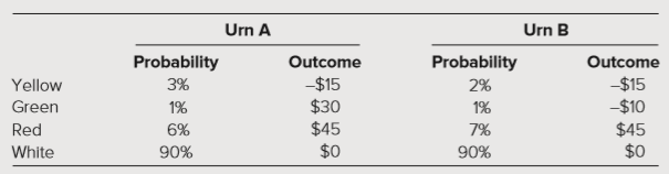 Imagine a decision task in which you are to choose between two alternatives that involve blindly drawing a single chip from one of two urns, labeled A and B respectively. Both urns contain colored balls. The proportion of the different colors is described below. Also described below are the payoffs from drawing a ball of a specific color from each of the two urns. Your task is to decide from which urn you would draw a ball, urn A or urn B.
