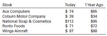 Stock Today 1 Year Ago $ 74 $ 39 $65 $34 $95 $72 $88 Ace Computers Coburn Motor Company National Soap & Cosmetics Ronto Foods $112 $ 71 $ 97 Wings Aircraft