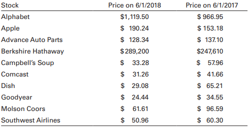 a. Calculate the percentage change in the stock price of each company over this 12-month period. Based on those calculations alone, would you guess that the overall stock market was up or down over this time?