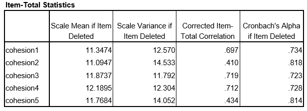 Item-Total Statistics Scale Mean if Item Scale Variance if Corrected Item- Cronbach's Alpha Deleted Item Deleted Total Correlation if Item Deleted cohesion1 cohesion2 12.570 14.533 11.3474 .697 .734 11.0947 .410 .818 cohesion3 cohesion4 cohesion5 11.8737 11.792 719 .723 12.1895 12.304 .712 .728 11.7684 14.052 .434 .814