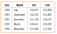 Year Month sth 13th 1990 July 134,012 132,908 1991 September 133,732 131,843 1991 December 121,139 118,723 1992 March 124,631 120,249 1992 November 117,584 117,263