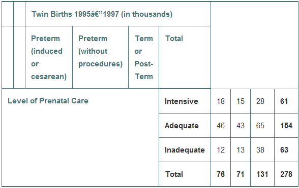In 2000, the Journal of the American Medical Association (JAMA) published a study that examined pregnancies that resulted in the birth of twins. Births were classified as preterm with intervention (induced labor or cesarean), preterm without procedures, or term/post-term. Researchers also classified the pregnancies by the level of prenatal medical care the mother received (inadequate, adequate, or intensive). The data, from the years 1995 1997, are summarized in the table below. Figures are in thousands of births. (JAMA 284 [2000]:335 341)