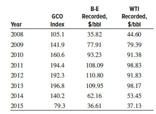 In 2015, Mariam, an engineer with Total Petroleum, decided to invest in stocks of a corporation that concentrates on crude oil production and refined products, though the price of oil is a very volatile commodity during recent years. She found the Global Crude Oil Index (GCO Index as shown in Table 15â3) on the web, plus the recorded annual prices (in dollars per barrel, $/bbl, as of December of each year) for two very well-known oil categoriesâBrent-Europe (B-E) and West Texas Intermediate (WTI). The data for all three are presented below for the period 2008 through 2015. The GCO Index has a base year of 2005 of 100 points.