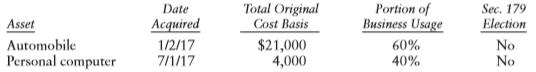 Total Original Cost Basis Portion of Business Usage Sec. 179 Election Date Asset Acquired $21,000 4,000 Automobile 1/2/17 7/1/17 60% 40% No Personal computer No