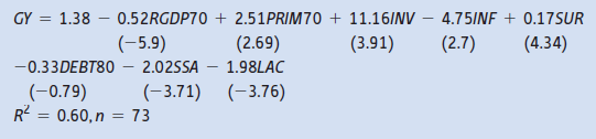 GY 1.38 0.52RGDP70 + 2.51PRIM70 + 11.16/NV 4.75INF + 0.17SUR (-5.9) (2.69) (3.91) (2.7) (4.34) -0.33DEBT80 2.02SSA 1.98LAC (-0.79) R2 = 0.60,n (-3.71) (-3.76) 73