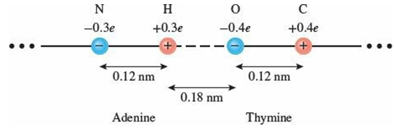 In a DNA molecule, the base pair adenine and thymine is held together by two hydrogen bonds (see Fig. 16.5). Letâs model one of these hydrogen bonds as four point charges arranged along a straight line. Using the information in the figure, calculate the magnitude of the net electric force exerted by one base on the other.