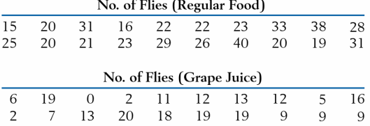 In a genetic study, a regular food was placed in each of 20 vials and the number of flies of a particular genotype feeding on each vial recorded. The counts of flies were also recorded for another set of 20 vials that contained grape juice. The following data sets were obtained (courtesy of C. Denniston and J. Mitchell).