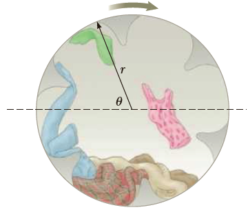 In a home laundry dryer, a cylindrical tub containing wet clothes is rotated steadily about a horizontal axis, as shown in Figure P7.61. So that the clothes will dry uniformly, they are made to tumble. The rate of rotation of the smooth-walled tub is chosen so that a small piece of cloth will lose contact with the tub when the cloth is at an angle of θ = 68.0° above the horizontal. If the radius of the tub is r = 0.330 m, what rate of revolution is needed in revolutions per second?