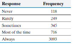 > In a national survey conducted by the Centers for Disease Control to determine college students’ health-risk behaviors, college students were asked, “How often do you wear a seatbelt when riding in a car driven by someone else?” The frequencies appear in