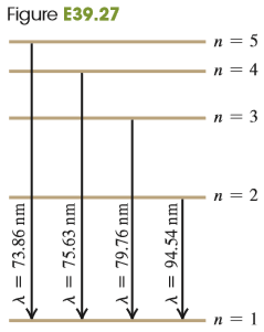 Figure E39.27 n = 5 n = 4 n = 3 n = 2 n = 1 A = 73.86 nm A = 75.63 nm \ = 79.76 nm| ,^ = 94.54 nm|