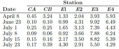 Station Date CA СВ El E2 E3 E4 April 8 June 23 0.45 3.24 1.33 2.04 3.93 5.93 0.10 0.10 0.99 4.31 9.92 6.49 July 1 July 8 July 15 July 23 0.25 0.25 1.65 3.13 7.39 4.43 0.09 0.06 0.92 3.66 7.88 6.24 0.15 0.16 2.17 3.50 8.82 5.39 0.17 0.39 4.30 2.91 5.50 4.29