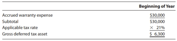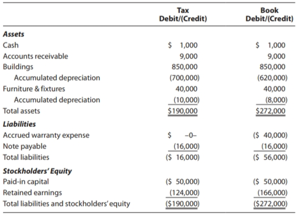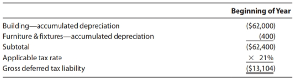 Book Debit/(Credit) Таx Debit/(Credit) Assets Cash $ 1,000 $ 1,000 Accounts receivable 9,000 9,000 Buildings 850,000 850,000 Accumulated depreciation (700,000) (620,000) Furniture & fixtures 40,000 40,000 Accumulated depreciation Total assets (10,000) $190,000 (8,000) $272,000 Liabilities Accrued warranty expense Note payable ($ 40,000) (16,000) ($ 56,000) $ -0- (16,000) ($ 16,000) Total liabilities Stockholders' Equity Paid-in capital Retained earnings Total liabilities and stockholders'equity ($ 50,000) (124,000) ($190,000) ($ 50,000) (166,000) ($272,000) Beginning of Year Accrued warranty expense Subtotal $30,000 $30,000 X 21% $ 6,300 Applicable tax rate Gross deferred tax Asset Beginning of Year Building-accumulated depreciation Furniture & fixtures-accumulated depreciation ($62,000) (400) Subtotal ($62,400) X 21% Applicable tax rate Gross deferred tax liability ($13,104)