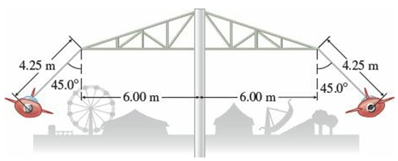 In an amusement park rocket ride, cars are suspended from 4.25 m cables attached to rotating arms at a distance of 6.00 m from the axis of rotation. The cables swing out at a constant angle of 45.0° when the ride is operating. What is the angular speed of rotation?