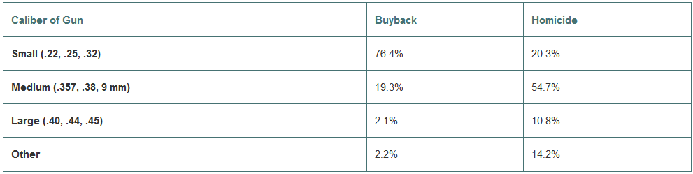 In an effort to reduce the number of gun-related homicides, some cities have run buyback programs in which the police offer cash (often $50) to anyone who turns in an operating handgun. Chance magazine looked at results from a four-year period in Milwaukee. The table below shows what types of guns were turned in and what types were used in homicides during a four-year period. Write a few sentences comparing the two distributions.