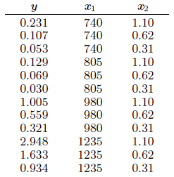 > In Exercise 12.28, page 462, we have the following data concerning wear of a bearing: (a) The following model may be considered to describe the data: yi = β0 + β1x1i + β2x2i + β12x1ix2i + i, for i = 1, 2,