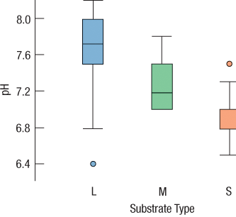 A lower pH means the water is more acidic. Here is a boxplot of the pH of the streams by substrate (limestone, mixed, or shale):