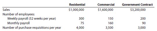 b. Using the activity base information in (a), determine the annual amount of payroll and purchasing costs charged back to the Residential, Commercial, and Government Contract divisions from payroll and purchasing services.
