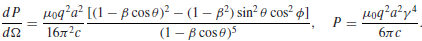 For relativistic velocities (β≈1) the radiation is again sharply peaked in the for- ward direction (Fig. 11.15). The most important application of these formulas is to circular motion—in this case the radiation is called synchrotron radiation. For a relativistic electron, the radiation sweeps around like a locomotive’s headlight as the particle moves.]](../images/in-ex--11-3-we-assumed-the-velocity-and-acceleration-259708-3.jpg)