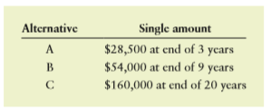 Alternative Single amount $28,500 at end of 3 ycars $54,000 at end of 9 years $160,000 at end of 20 years A B C