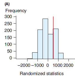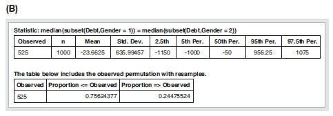 In exercise 13.24 you compared credit card debts for college men and women using the Mann-Whitney test to compare medians. Weâll use the same data again, but this time you will apply a randomization test to determine whether men and women in college have different median credit card debts. There were 19 men and 18 women in this data set. As part of the randomization test, the credit card debts were randomly assigned the label âmanâ or âwoman,â and the difference of the medians (men minus women) was calculated and recorded. This was repeated 1000 times. Figure A shows a histogram of the resulting differences of medians, and Figure B shows the resampling output.