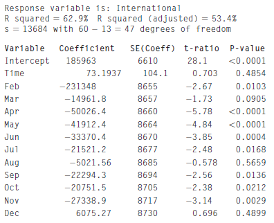 d) Even though the R2 for this model is lower than the corresponding R2 for the model fit in Exercise 39 to domestic tourist visits, you might feel more comfortable predicting the number of international visitors for April 2007 with this model than you did predicting the number of domestic visitors with the previous model. Explain why.