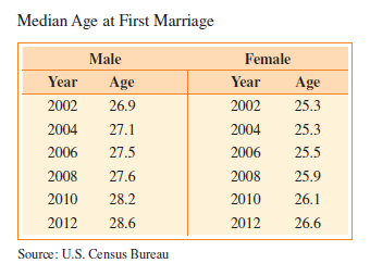 38. (a) Draw a bar graph that appears to show a small increase in the median age at first marriage for female
