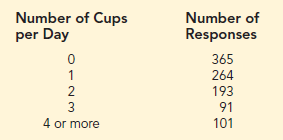 In Gallupâs Annual Consumption Habits Poll, telephone interviews were conducted for a random sample of 1014 adults aged 18 and over. One of the questions was, âHow many cups of coffee, if any, do you drink on an average day?â The following table shows the results obtained (Gallup website).