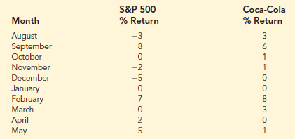 In June of 2016, Yahoo Finance reported the beta value for Coca-Cola was .82 (Yahoo Finance website). Betas for individual stocks are determined by simple linear regression. The dependent variable is the total return for the stock, and the independent variable is the total return for the stock market, such as the return of the S&P 500. The slope of this regression equation is referred to as the stockâs beta. Many financial analysts prefer to measure the risk of a stock by computing the stockâs beta value. The data contained in the DATAfile named CocaCola show the monthly percentage returns for the S&P 500 and the Coca-Cola Company for August 2015 to May 2016.