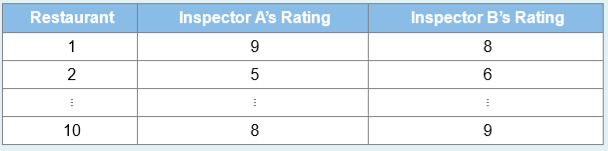 In order to ensure the publicâs health and safety, state health inspectors are required to rate the cleanliness and quality of all restaurants in the state. Restaurants that consistently score below a certain level often lose their licenses to operate. From a sample of 10 restaurants, two health inspectors give the ratings where a score of 10 denotes excellence in cleanliness and quality. A portion of the data is shown in the accompanying table.