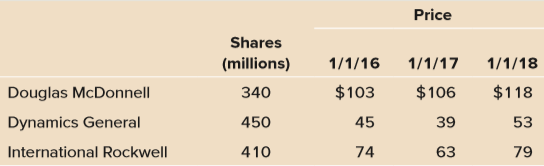Price Shares (millions) 1/1/16 1/1/17 1/1/18 Douglas McDonnell 340 $103 $106 $118 Dynamics General 450 45 39 53 International Rockwell 410 74 63 79