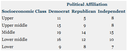 In recent years, the debate over the U.S. economy has been constant. The electorate seems somewhat divided as to whether the economy is in a recovery or not. Suppose a survey was undertaken to ascertain whether the perception of economic recovery differs according to political affiliation. People were selected for the survey from the Democratic Party, the Republican Party, and those classifying themselves as independents. A 25-point scale was developed in which respondents gave a score of 25 if they felt the economy was definitely in complete recovery, a 0 if the economy was definitely not in a recovery, and some value in between for more uncertain responses. To control for differences in socioeconomic class, a blocking variable was maintained using five different socioeconomic categories. The data are given here in the form of a randomized block design. Use α = .01 to determine whether there is a significant difference in mean responses according to political affiliation.