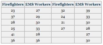 In some firefighting organizations, you must serve as a firefighter for some period of time before you can become part of the emergency medical service (EMS) arm of the organization. Does that mean EMS workers are older, on average, than traditional firefighters? Use the data shown and ( = .05 to test whether EMS workers are significantly older than firefighters. Assume the two groups are independent and you do not want to use a t test to analyze the data.