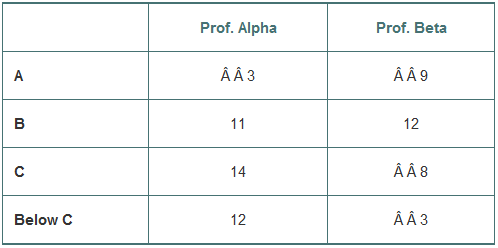 In some situations where the expected cell counts are too small, as in the case of the grades given by Professors Alpha and Beta in Exercise 43, we can complete an analysis anyway. We can often proceed after combining cells in some way that makes sense and also produces a table in which the conditions are satisfied. Here, we create a new table displaying the same data, but calling D and F Below C: