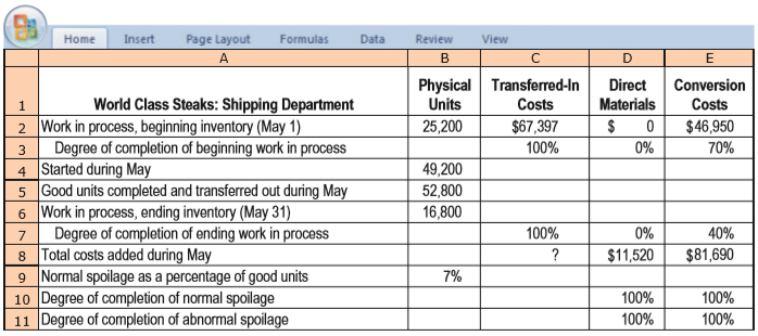 Insert Formulas Home Page Layout Data Review View A В D Physical Transferred-In Units Direct Conversion World Class Steaks: Shipping Department Costs Materials Costs 1. 2 Work in process, beginning inventory (May 1) Degree of completion of beginning work in process 4 Started during May 5 Good units completed and transferred out during May 6 Work in process, ending inventory (May 31) Degree of completion of ending work in process 8 Total costs added during May 9 Normal spoilage as a percentage of good units 10 Degree of completion of normal spoilage 11 Degree of completion of abnormal spoilage 25,200 $67,397 $ $46,950 3 100% 0% 70% 49,200 52,800 16,800 7 100% 0% 40% ? $11,520 $81,690 7% 100% 100% 100% 100%