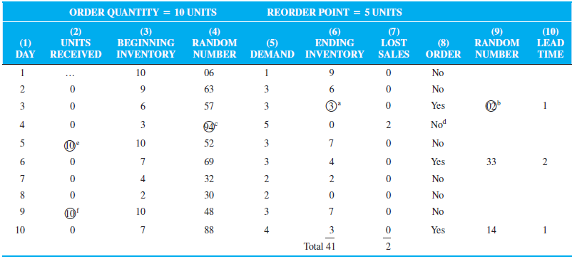 ORDER QUANTITY = 10 UNITS REORDER POINT = 5 UNITS (4) RANDOM (10) (2) UNITS (3) (6) (7) LOST (9) RANDOM (1) DAY BEGINNING (5) NUMBER DEMAND INVENTORY ENDING (8) ORDER NUMBER LEAD RECEIVED INVENTORY SALES TIME 1 10 06 1 9 No 63 3 No 3 6. 57 3 Yes 4 3 5 2 No 10 52 3 7 No 7 69 3 4 Yes 33 7 4 32 2 2 No 8. 30 2 No 10 48 3 7 No 10 7 88 3 Yes 14 Total 41