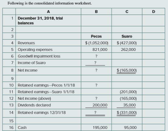 â Selected amounts from Pecos and Suaroâs separate financial statements at December 31, 2018, are presented in the consolidated information worksheet. All consolidated worksheets are to be prepared as of December 31, 2018, two years subsequent to acquisition.