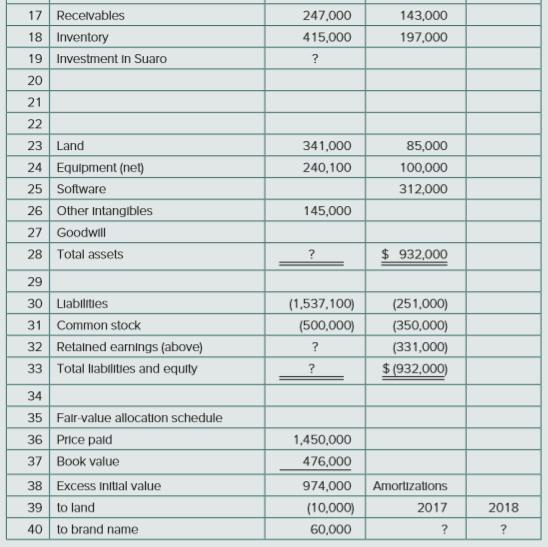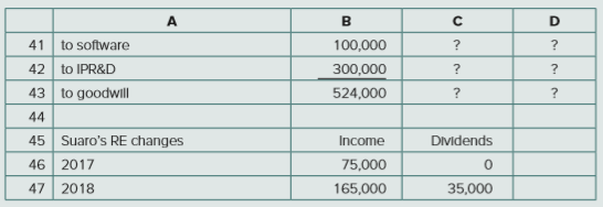 Assets Llabilities and Equlty Cash $ 37,000 Llabilities... $(422,000) Recelvables 82,000 Inventory.. Land.... 149,000 Common stock (350,000) (126,000) 90,000 225,000 Retalned earnings. . Equipment (net) . 315,000 $898,000 Software.. Total assets Total llabilities and equity .. ${898,000) $ 80,000 60,000 415,000 300,000 Land (Indefinite life-unrecognized on Suaro's books) (2-year estimated remalning useful life) Brand name Software In-process R&D Following is the consolidated information worksheet. A B 1 December 31, 2018, trial balances Pecos Suaro 4 Revenues $ (1,052,000) $ (427,000) 5 Operating expenses 6 Goodwll Impalrment loss 7 Income of Suaro 8 Net Income 821,000 262,000 ? $ (165,000) ? 9 10 Retalned earnings-Pecos 1/1/18 ? 11 Retalned earnings-Suaro 1/1/18 (201,000) 12 Net income (above) 13 DIvidends declared 14 Retalned earnings 12/31/18 (165,000) 200,000 35,000 $ (331,000) 15 16 Cash 195,000 95,000 17 Recelvables 247,000 143,000 18 Inventory 415,000 197,000 19 Investment In Suaro 20 21 22 23 Land 341,000 85,000 24 Equipment (net) 25 Software 26 Other Intangibles 240,100 100,000 312,000 145,000 27 Goodwill 28 Total assets ? $ 932,000 29 (1,537,100) (251,000) (350,000) (331,000) $ (932,000) 30 Llabilities 31 Common stock (500,000) 32 Retalned earnings (above) ? 33 Total llabilitles and equity ? 34 35 Falr-value allocation schedule 36 Price pald 37 Book value 1,450,000 476,000 38 Excess Initial value 974,000 Amortizations 39 to land (10,000) 2017 2018 40 to brand name 60,000 A B D 41 to software 100,000 ? 42 to IPR&D 300,000 43 to goodwill 524,000 ? 44 45 Suaro's RE changes DIvidends Income 46 2017 75,000 47 2018 165,000 35,000