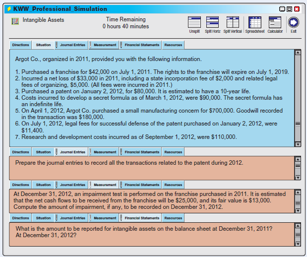KWW Professional Simulation I Intangible Assets Time Remaining O hours 40 minutes Unspit Spit Hortz Spi Vertical Spreadsheet Calculator Ext Diroctions Situation Journal Entrios Measurement Financial Statoments Rosourcos Argot Co., organized in 2011, provided you with the following information. 1. Purchased a franchise for $42,000 on July 1, 2011. The rights to the franchise will expire on July 1, 2019. 2. Incurred a net loss of $33,000 in 2011, including a state incorporation fee of $2,000 and related legal fees of organizing, $5,000. (All fees were incurred in 2011.) 3. Purchased a patent on January 2, 2012, for $80,000. It is estimated to have a 10-year life. 4. Costs incurred to develop a secret formula as of March 1, 2012, were $90,000. The secret formula has an indefinite life. 5. On April 1, 2012, Argot Co. purchased a small manufacturing concern for $700,000. Goodwill recorded in the transaction was $180,000. 6. On July 1, 2012, legal fees for successful defense of the patent purchased on January 2, 2012, were $11,400. 7. Research and development costs incurred as of September 1, 2012, were $110,000. Diroctions Situation Journal Entries Moasuromant Financial Statoments Resources Prepare the journal entries to record all the transactions related to the patent during 2012. Situation Journal Entrios Financial Statemonts Rosources Diroctions Msasurement At December 31, 2012, an impairment test is performed on the franchise purchased in 2011. It is estimated that the net cash flows to be received from the franchise will be $25,000, and its fair value is $13,000. Compute the amount of impairment, if any, to be recorded on December 31, 2012. Diroctions Stuation Journal Entrios Measuroment Financial Statoments Resources What is the amount to be reported for intangible assets on the balance sheet at December 31, 2011? At December 31, 2012?