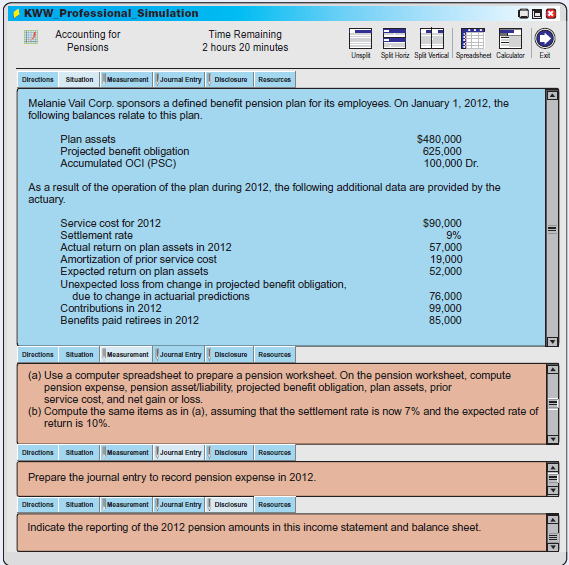KWW_Professional_Simulation Accounting for Pensions Time Remaining 2 hours 20 minutes Unsplit Spit Horiz Spit Vertical Spreadsheet Calcuator Exit Situation Measuromant Jourmal Entry Disclosure Rasources Directions Melanie Vail Corp. sponsors a defined benefit pension plan for its employees. On January 1, 2012, the following balances relate to this plan. Plan assets Projected benefit obligation Accumulated OCI (PSC) $480,000 625,000 100,000 Dr. As a result of the operation of the plan during 2012, the following additional data are provided by the actuary. $90,000 9% 57,000 19,000 52,000 Service cost for 2012 Settlement rate Actual return on plan assets in 2012 Amortization of prior service cost Expected return on plan assets Unexpected loss from change in projected benefit obligation, due to change in actuarial predictions Contributions in 2012 Benefits paid retirees in 2012 76,000 99,000 85,000 Measuromant Journal Entry Disclosure Rasources Directions Situation (a) Use a computer spreadsheet to prepare a pension worksheet. On the pension worksheet, compute pension expense, pension asset/liability, projected benefit obligation, plan assets, prior service cost, and net gain or loss. (b) Compute the same items as in (a), assuming that the settlement rate is now 7% and the expected rate of return is 10%. Directions Moasuromant Journal Entry Disciosure Resources Situation Prepare the journal entry to record pension expense in 2012. Directions Situation Measurament Journal Entry Disdlosure Resourcas Indicate the reporting of the 2012 pension amounts in this income statement and balance sheet.